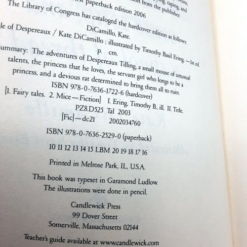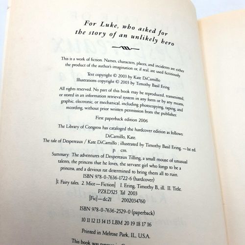 SYNOPSIS: 269 pages. Illustrated by Timothy Basil Ering. "The main plot follows the adventures of a mouse named Despereaux Tilling, as he sets out on his quest to save a captured human princess from the villainous rats." The book won the 2004 Newbery Medal award and has been adapted into a film and a video game loosely based on the book, as well as a stage musical. PUBLISHER: Candlewick Press, 2006, Somerville, MA. Stated 1st Paperback Edition, shown by number line as 10th printing.