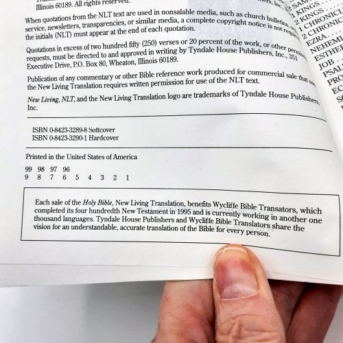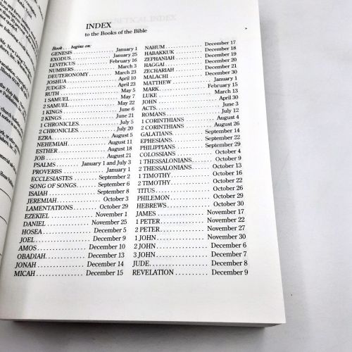 SYNOPSIS: 1442 pages. "The entire New Living Translation Arranged in 365 Daily Readings." Publisher: Tyndale House Publishers, Wheaton, IL. 1996. Number line shows as 1st printing.