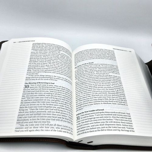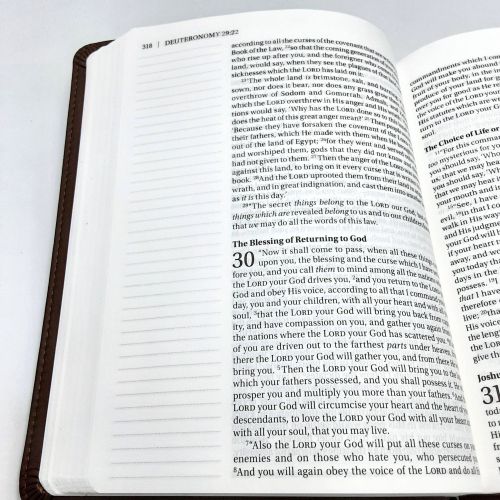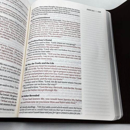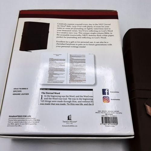 FORMAT: Each page has plenty of room for notes or verse art journaling next on each side. Unique brown leather covers with leather strap to hold closed, single-column large print edition features thick cream-colored paper with lightly ruled lines in the extra-wide margins. Features Lined, 2"-wide margins for notes, reflections and art Thicker cream paper for enduring note-taking Large print 10 point text size eliminates eye strain when reading Words of Jesus in red Lays flat when open Two ribbon markers Protective end flap closure with leather strap 8.25" x 6.75" x 2.50", quite heavy