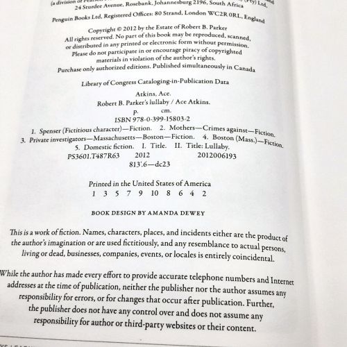 pages. "Lullaby is the 41st novel featuring Robert B. Parker's fictional detective Spenser. It is the first official Spenser novel not written by Parker, but by Ace Atkins. Atkins was asked to write the novel after Parker's death in 2010."