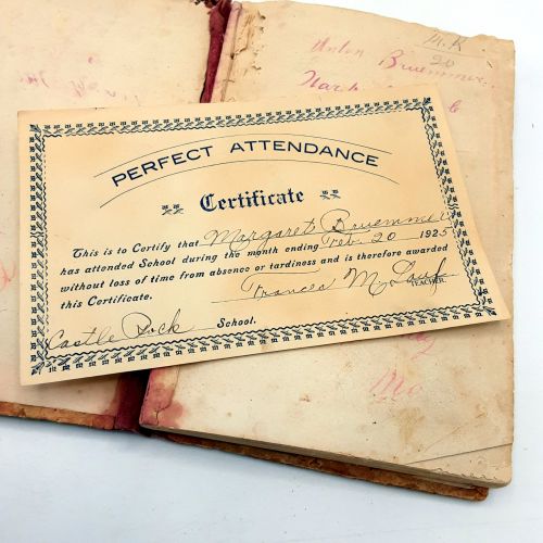 Measures 8.5 x 4.5." BONUS: "Perfect Attendance Certificate" dated Feb. 20 1925 found inside.